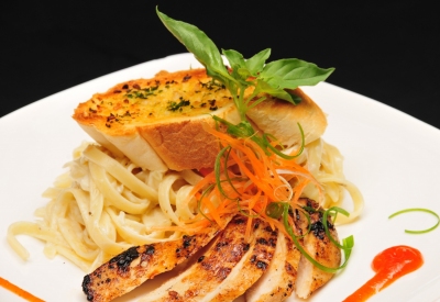 Our chef's fresh fettuccini pasta sauteed with alfredo sauce served with grilled chicken and garlic bread.