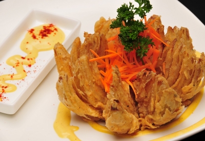 Crispy seasoned fried onion blossom served with cream honey mustard sauce.