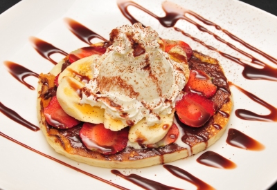 Two fluffy homemade pancakes topped with fresh strawberry, banana served with whip cream.