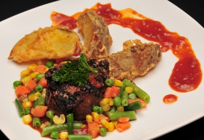 Grilled 200 gr cut Australian steak served with choice of veggies, potato and sauce.