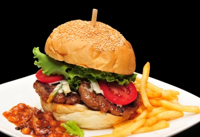 Grilled 3 pcs beef burger served with mayo, mix veggie, BBQ bean and fries.